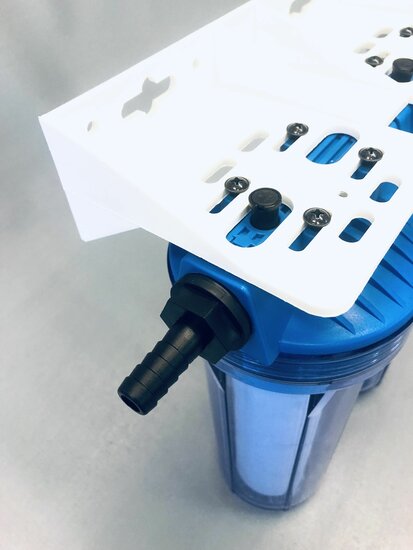 Monteer het filtersysteem met behulp van de meegeleverde wandbeugel. Zorg voor circa 10 cm ruimte onder het systeem om de filterkommen en filterelementen eenvoudig los te kunnen draaien.
