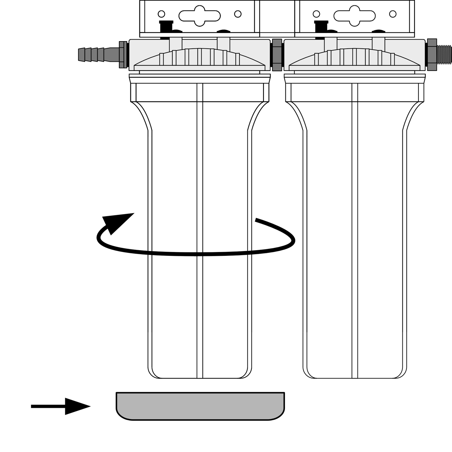 Plaats nieuwe PP- en carbon-granulaatfilterelementen in de behuizingen. Draai de filterkommen weer vast; niet te strak – vast is vast. Controleer of de rubber afdichtringen schoon zijn en goed in positie liggen.
