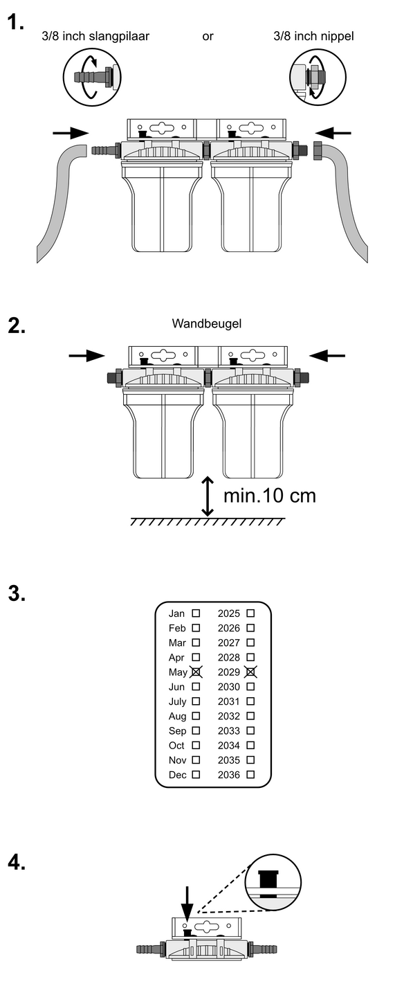 Noteer de datum van ingebruikname op de meegeleverde datumsticker en plak deze zichtbaar op de filterbehuizing. De geadviseerde gebruiksduur is 1 jaar; de werkelijke levensduur van de filterelementen is afhankelijk van de mate van vervuiling in het te behandelen water. Zolang er water door de filters stroomt, is het veilig om te drinken – ook wanneer de doorstroomsnelheid afneemt.
